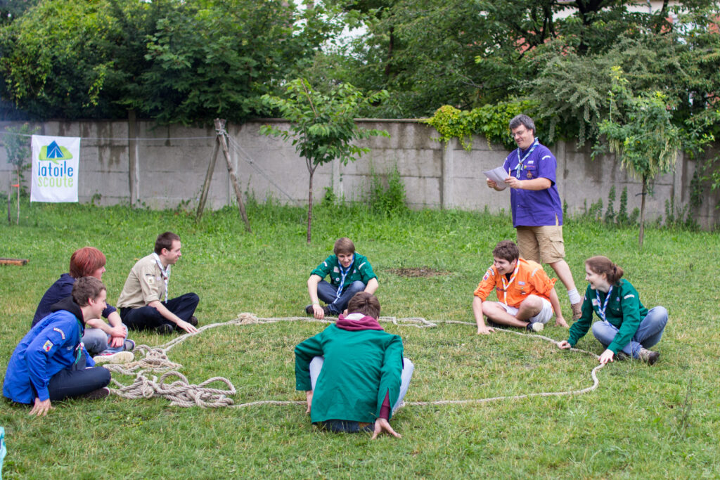 Les joueurs s’assoient par terre en ronde autour du meneur de jeu.