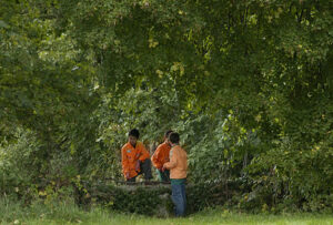 Les jeunes sont répartis en 8 équipes avec de quoi noter. Les personnages sont à différents endroits du terrain de jeu.