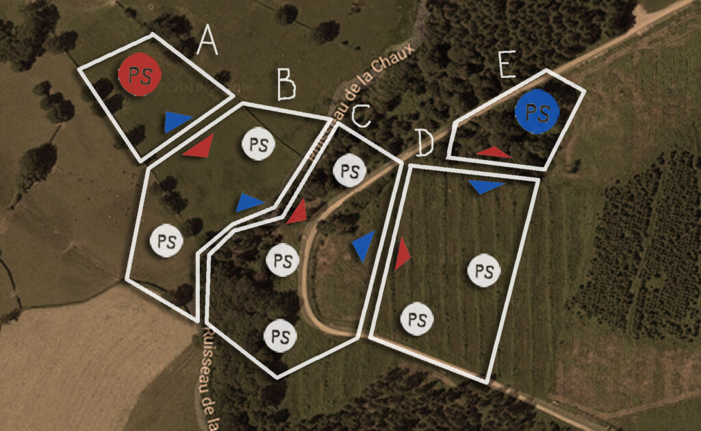 • Les zones Bases doivent être équidistante entre elle. Le nombre de base est égale au nombre d’équipe moins un. Dans notre exemple il y a quatre équipes, donc trois bases.