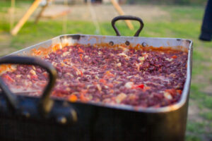 - 1 à 2 chipolatas/merguez/saucisse de Francfort/knack par personne ou d’autres viandes (ou tofu/protéines de soja/base de légumes selon les restes)
