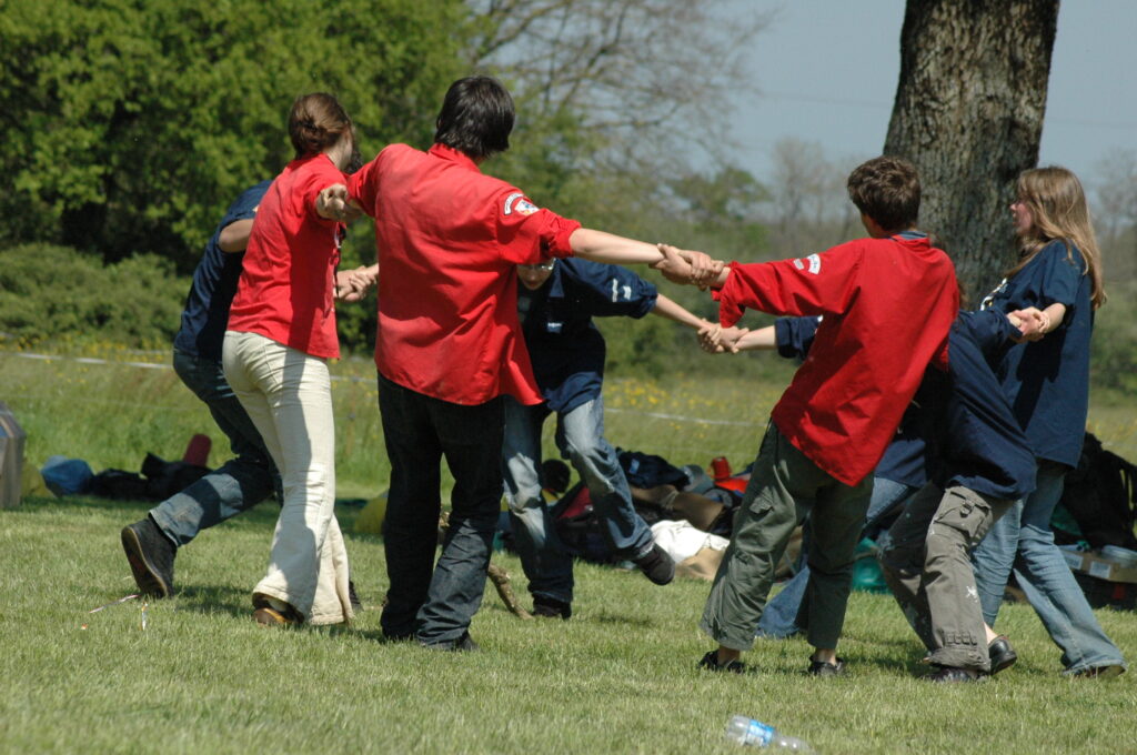 La patrouille qui a réalisé ce trépied s’était juste lancée dans la construction une table aux dimensions phénoménales ! La perche la plus longue du trépied ne mesurait pas moins de huit mètres de long. Une fois monté, il a fallu se rendre à l’évidence : un quatrième pied était indispensable afin de pouvoir construire la table.