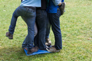 Par groupe de 20 les personnes mettent un de leurs pieds en un même point. Ils ferment les yeux et tendent la main du côté du cercle afin de trouver une autre main. Quand chacun a déjà une main on fait pareil avec la 2e. Il ne doit pas y avoir de main « libre ».