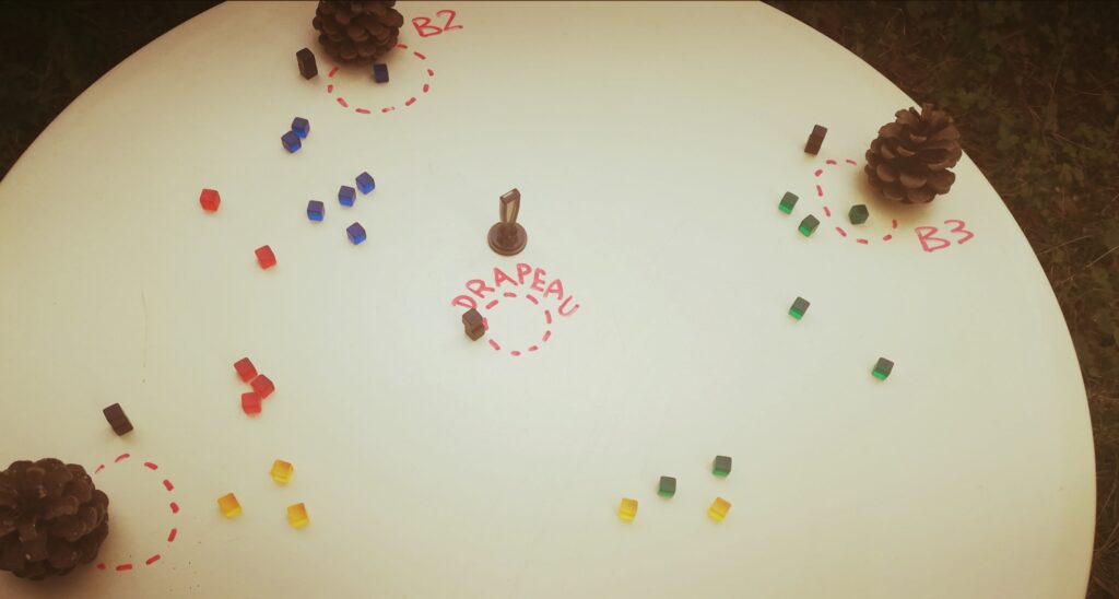 Si par exemple l’équipe rouge remplit cet objectif, la manche se termine: la ligne de front avance en leur faveur. Le nouveau secteur d’affrontement est donc le D. Dans ce cas, l’équipe rouge devient “offensive”, et l’équipe bleue, la perdante, devient “défensive”. Lors de la manche qui va suivre: