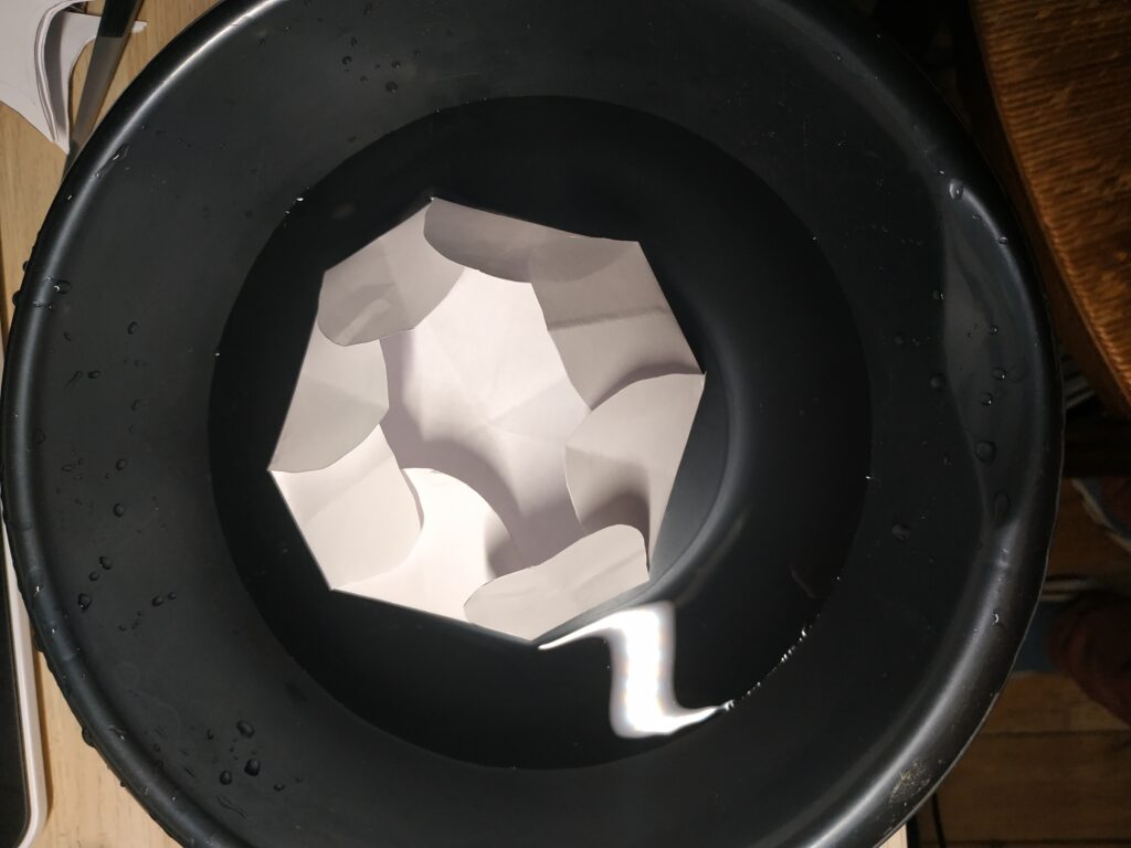 Ensuite il faut découper un rond dans ta feuille en plastique, à peu près de la taille du lotus que tu as réalisé. Tu pose la feuille délicatement sur le plan d’eau, tu pose le lotus dessus, et hop, tu as un super lotus qui flotte !