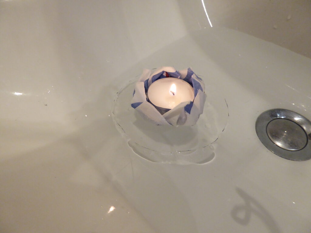 Remplis une bassine d’eau et dépose le nénuphar, pétales vers le haut puis regarde le se déplier sur l’eau.